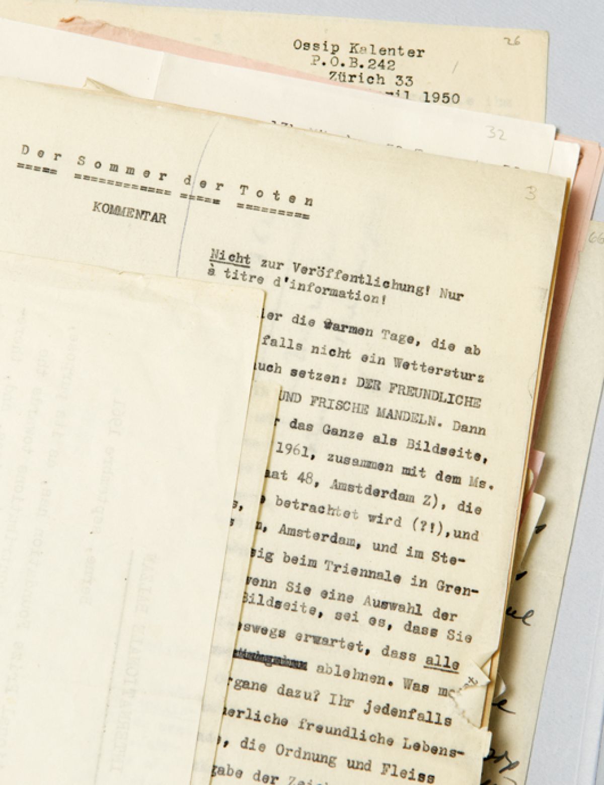 In dieser Funktion war er in ähnlicher Weise wie Carl Seelig für die Belange der exilierten und über viele Länder versprengten Autoren aktiv. Sein Nachlass umfasst die gesamten Akten dieser Tätigkeit und stellt ein hoch bedeutsames Dokument deutscher Literaturgeschichte im Ausland dar. Es finden sich darin Korrespondenzen so unterschiedlicher Persönlichkeiten wie Wilhelm Sternfeld, Oskar Maria Graf, Hermann Broch, Alfred Kerr, Claire Goll, Paul Celan, Ferdinand Hardekopf, Hans Purrmann und vielen anderen mehr. Auch die literarischen Manuskripte Kalenters selber, seine Tagebücher und Unterlagen zur Edition von Rilke-Briefen sind in dem Bestand enthalten.